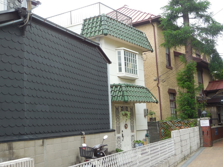 これは北野町四丁目にある。トーアロードの外人クラブ(元のトーアホテル)の南側の通りを東に行くと、大成株式会社の看板と、その青空駐車場が山側にある。この隣りの盧観源氏邸の東側にやや斜めに北行する小径があり、そこを東北に登ると五十メートルも行かないうちに、このボリヴィア領事館に出る。これから左に行けば北野町本通りに出るし、右に行けば北野交番西側の通りに出る。この建物もなかなか頑丈に建てられた建物だ。二階の手摺りにボリヴィア領事のマークがあっておもしろい。戦前にはこのようなマークのついた領事館が二十軒ほどあり、そのマークの模様が先進国ほど立派で見事だったことを覚えている。今は元居留地に行っても、北野町、山本通りを歩いても、全然見られなくなってしまった。しみじみ惜しいと思うのである。