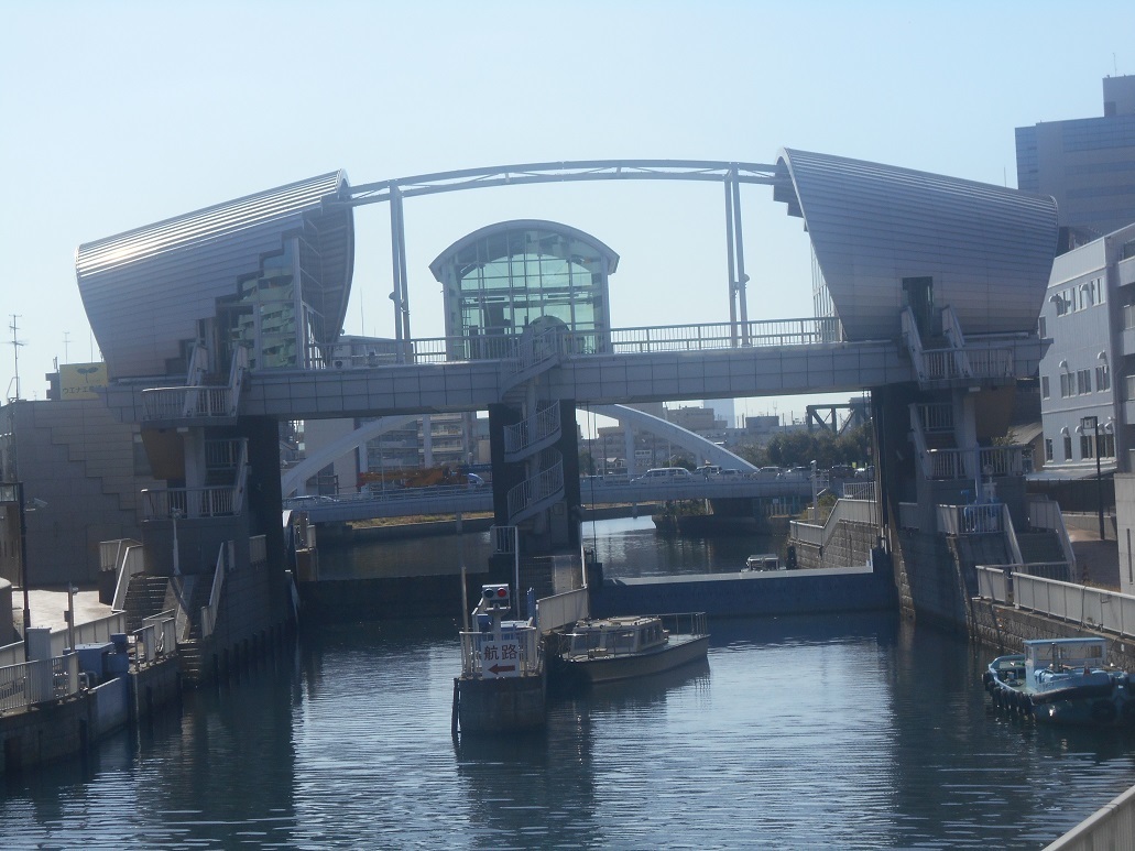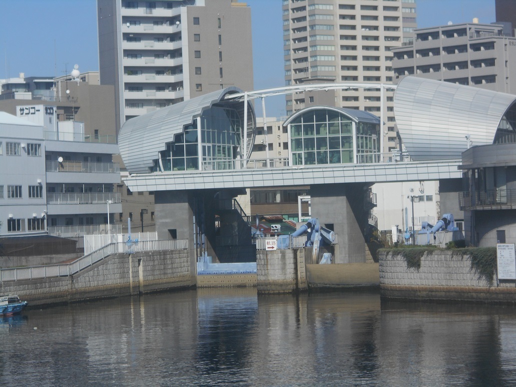 道頓堀川と木津川の合流点に設けられた、メタリックな水門。とんぼりウォーク等、水都大阪復活をめざした河川整備の一環として、水質浄化や水位の一定化などの目的により2001年3月に建設された。道頓堀川水門と東横堀川水門との開閉操作によって、東横堀川と道頓堀川の水質の浄化をしています。これは、道頓堀川水辺整備事業の一環で、上げ潮と下げ潮の潮位を利用して、道頓堀川への水の出入りを調節して、寝屋川の汚れた水は大川に流して、道頓堀川を浄化しようとするものです。 水門は左岸側と右岸側の2門になっていて、左岸側の下流のラジアルゲート型水門と、上流川のマイタ−ゲート型水門の操作で、船を航行させる閘門の機能を持っている。右岸側は、スルースゲート水門になっています。道頓堀川水門に最も近づけるのは、上流側では日吉橋、下流側は、木津川にかかる大正橋の西詰です。ゲートの上に水門似つかわしくないような、すっきりとした管理棟を付けて、街中に溶け込むデザインになっています。ゲートの幅は、右岸側・左岸側ともに10m位のもので、コンパクトな設計の水門です。なにわ探検クルーズの川の環状線コースに乗船すると、この、道頓堀川水門と、東横堀川水門の両方を間近に見ることができる。