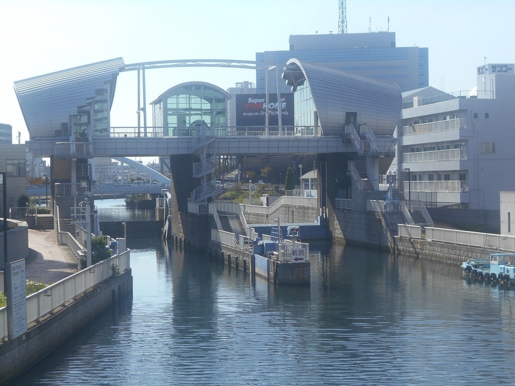 道頓堀川と木津川の合流点に設けられた、メタリックな水門。とんぼりウォーク等、水都大阪復活をめざした河川整備の一環として、水質浄化や水位の一定化などの目的により2001年3月に建設された。道頓堀川水門と東横堀川水門との開閉操作によって、東横堀川と道頓堀川の水質の浄化をしています。これは、道頓堀川水辺整備事業の一環で、上げ潮と下げ潮の潮位を利用して、道頓堀川への水の出入りを調節して、寝屋川の汚れた水は大川に流して、道頓堀川を浄化しようとするものです。 水門は左岸側と右岸側の2門になっていて、左岸側の下流のラジアルゲート型水門と、上流川のマイタ−ゲート型水門の操作で、船を航行させる閘門の機能を持っている。右岸側は、スルースゲート水門になっています。道頓堀川水門に最も近づけるのは、上流側では日吉橋、下流側は、木津川にかかる大正橋の西詰です。ゲートの上に水門似つかわしくないような、すっきりとした管理棟を付けて、街中に溶け込むデザインになっています。ゲートの幅は、右岸側・左岸側ともに10m位のもので、コンパクトな設計の水門です。なにわ探検クルーズの川の環状線コースに乗船すると、この、道頓堀川水門と、東横堀川水門の両方を間近に見ることができる。